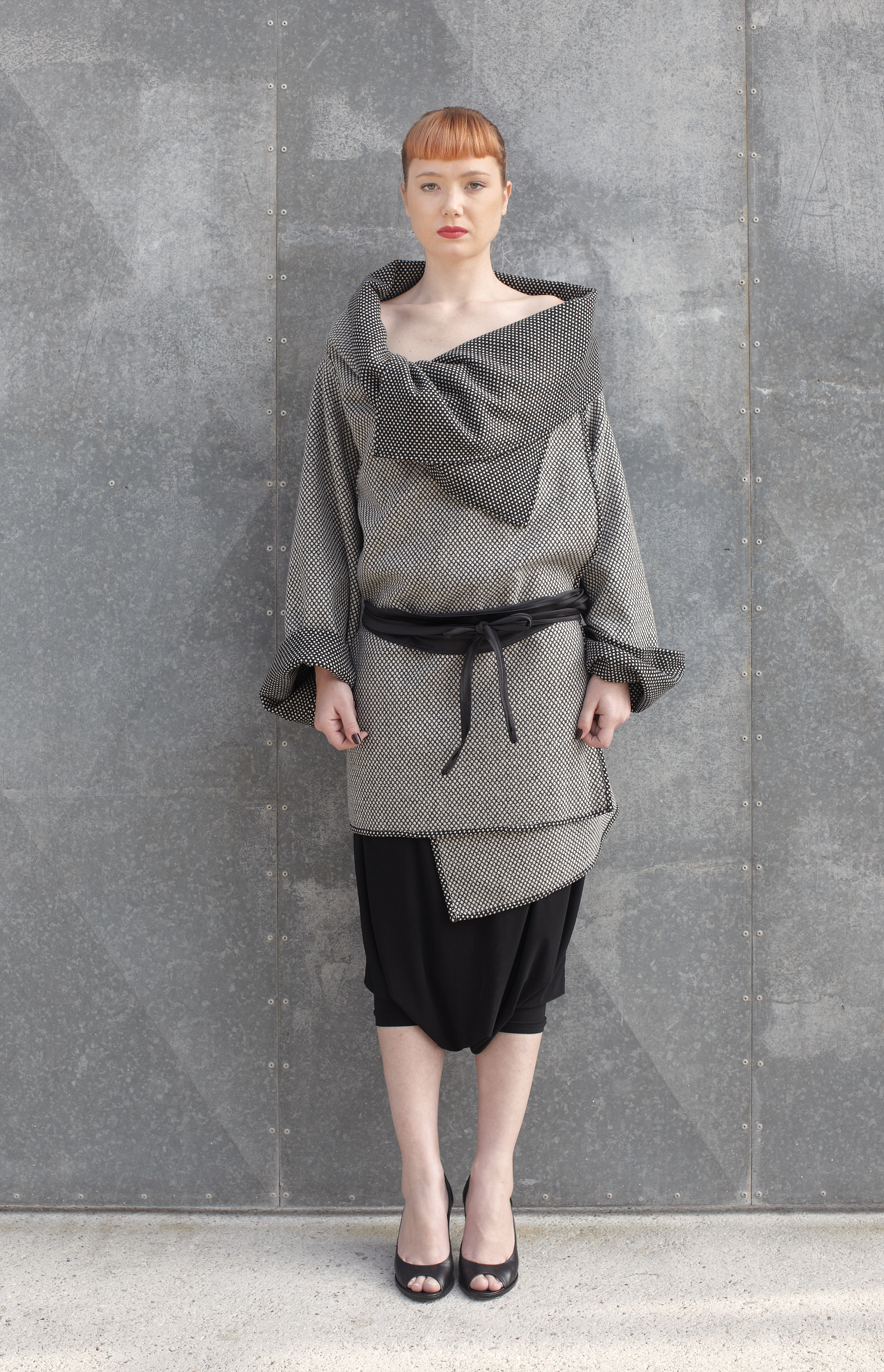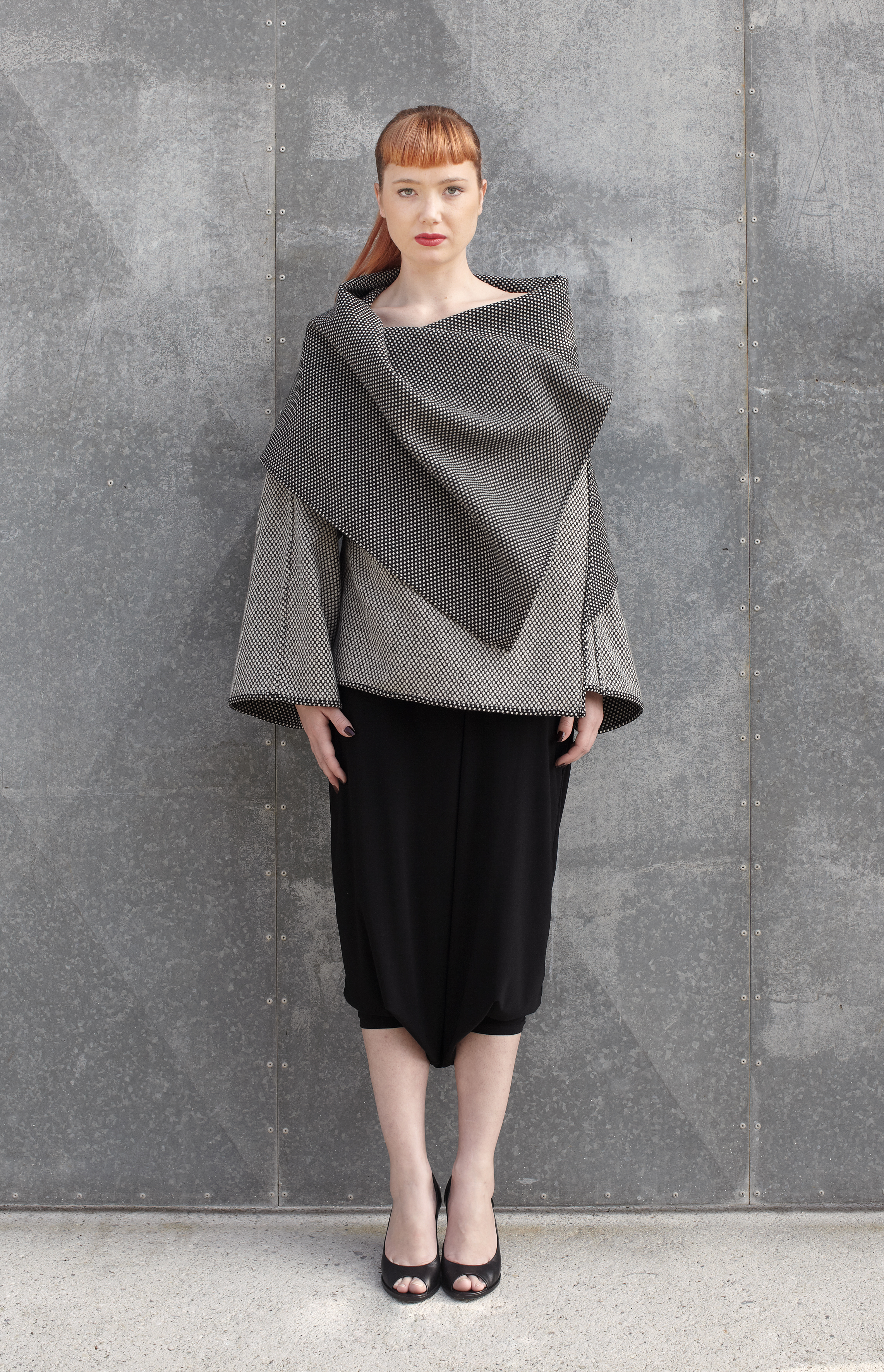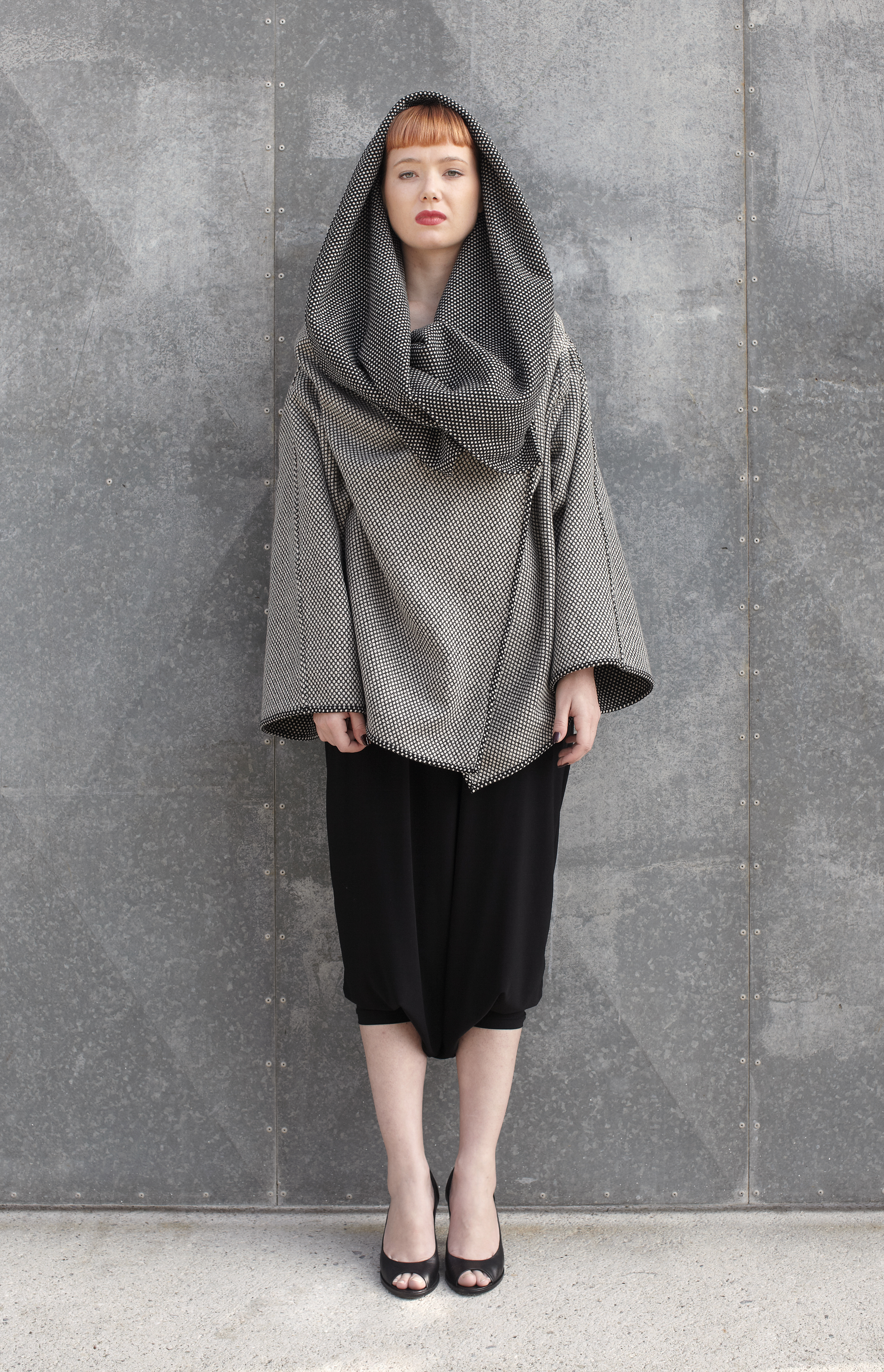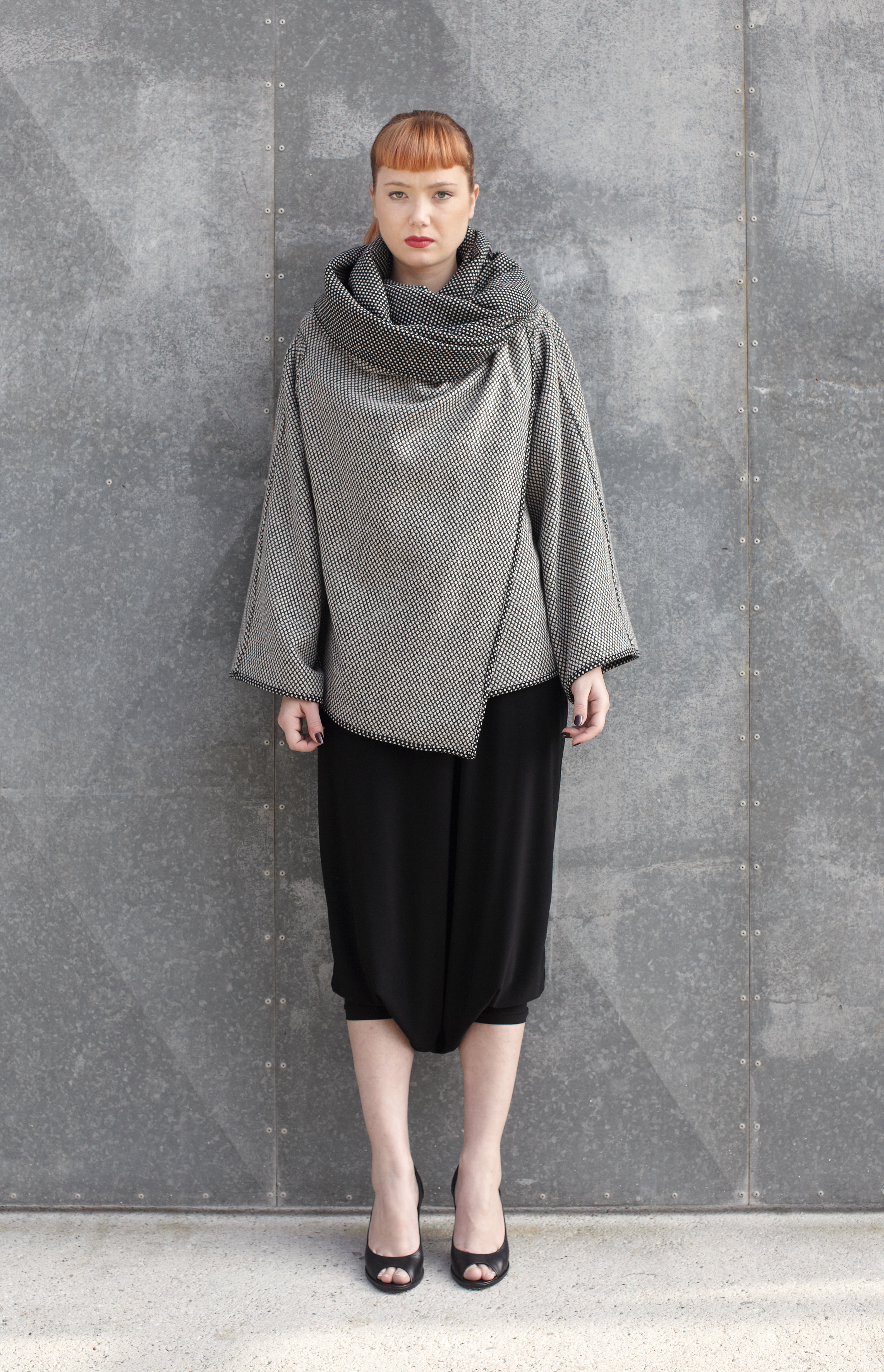 According to the body size and the type of fabric, it can be worn as a jacket, a cloak, a dress or a skirt. Belted, secured with a brooch or simply put down the shoulders with no strings, this item and its exclusive line surprise you every time. When worn upside down, it magically becomes short, boasting a giant neck or a stylish hood.